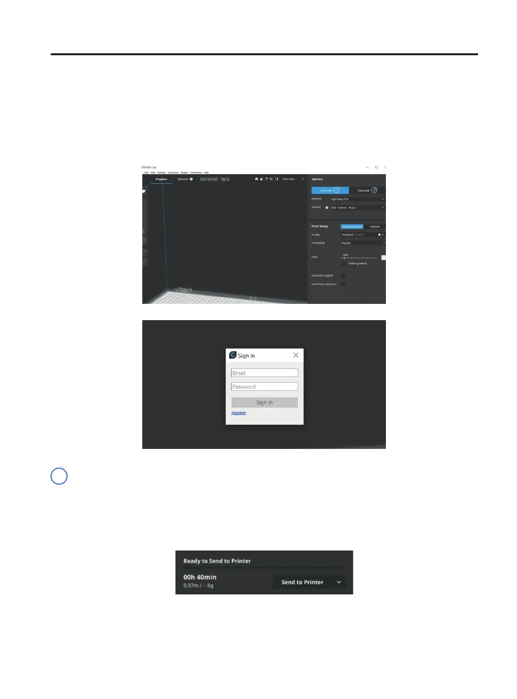 • Slice the project in BCN3D Cura as shown in Preparing a print and a Send to Printer button will appear on the