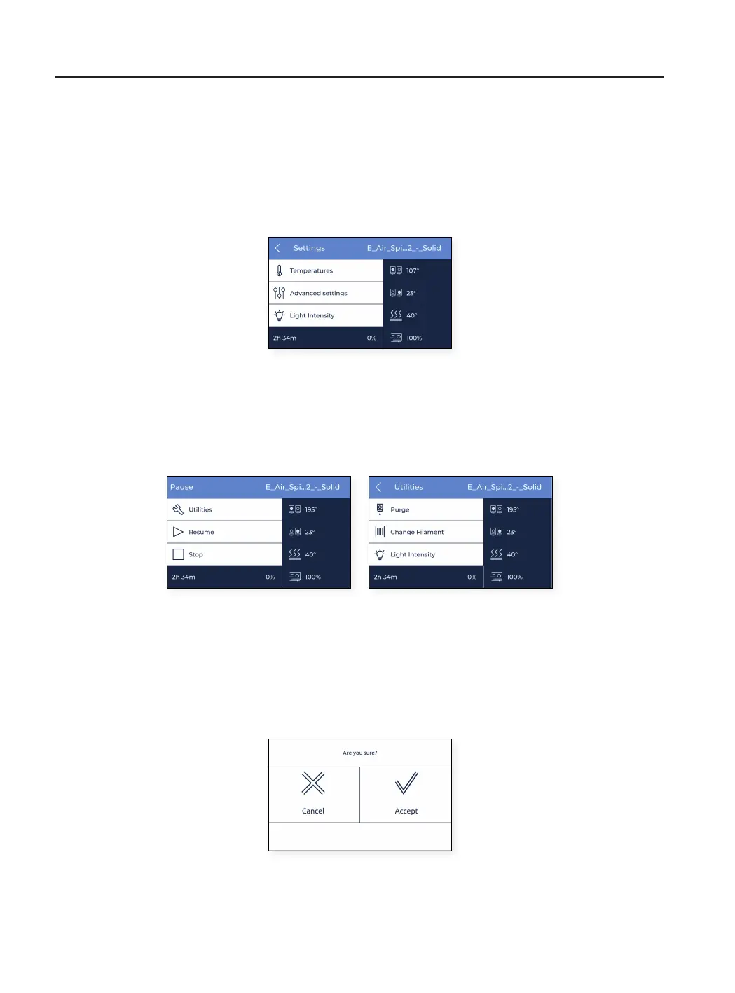 1. Settings: access to several parameters that can be tweaked during a print: adjust build plate and hotend