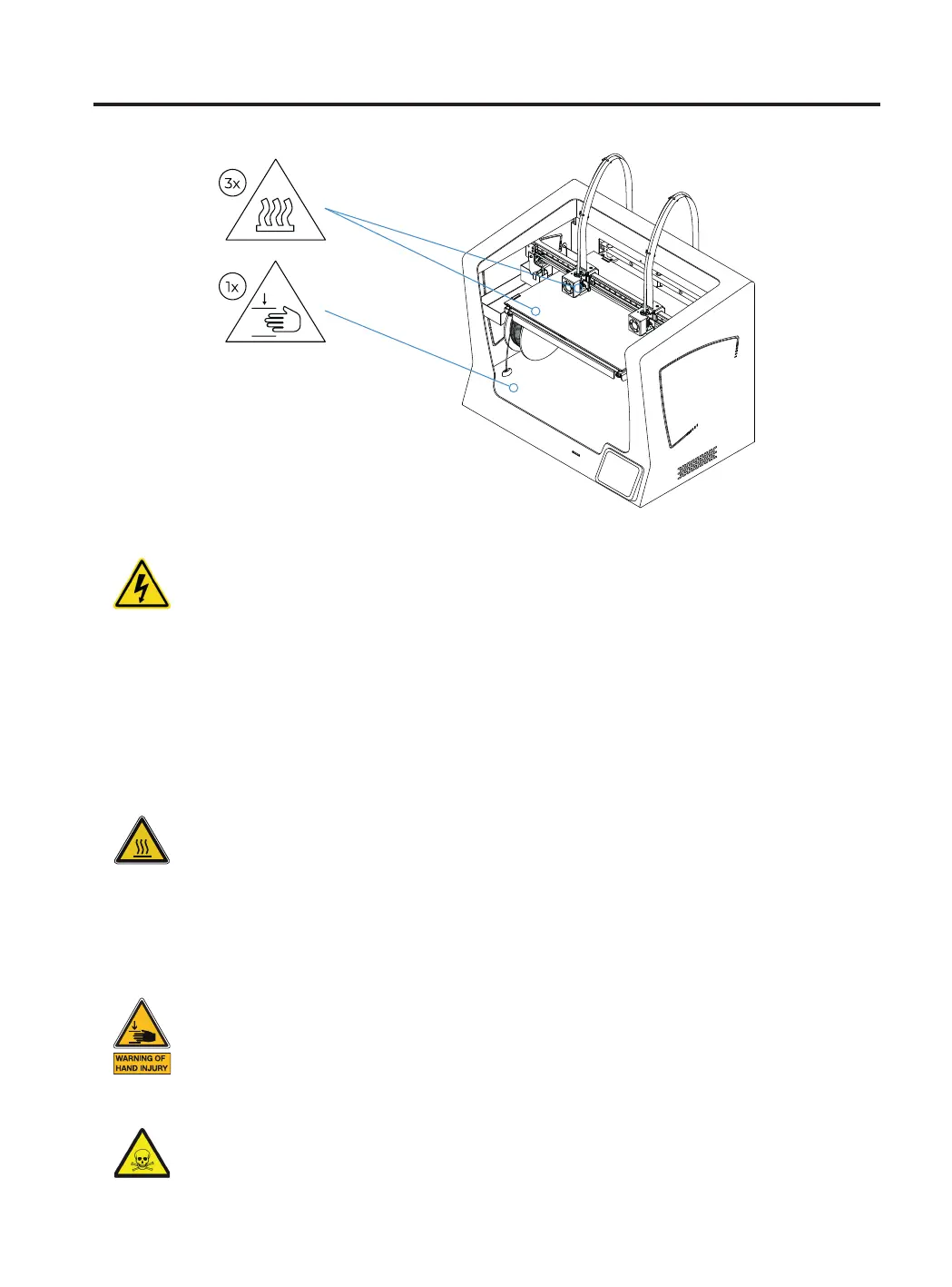 Do not touch the hot parts (heated bed and hot-ends) when the machine is switched on, and wait