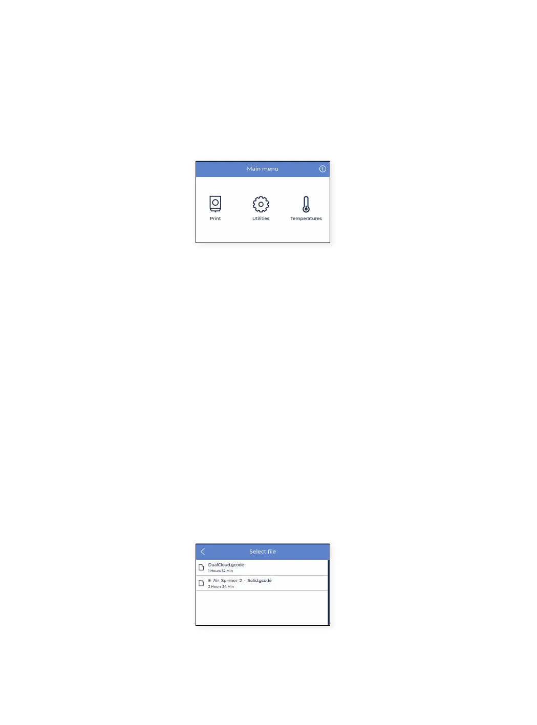 Files in the list show in alphabetical order. Scroll with your finger and tap the desired print job in order to start