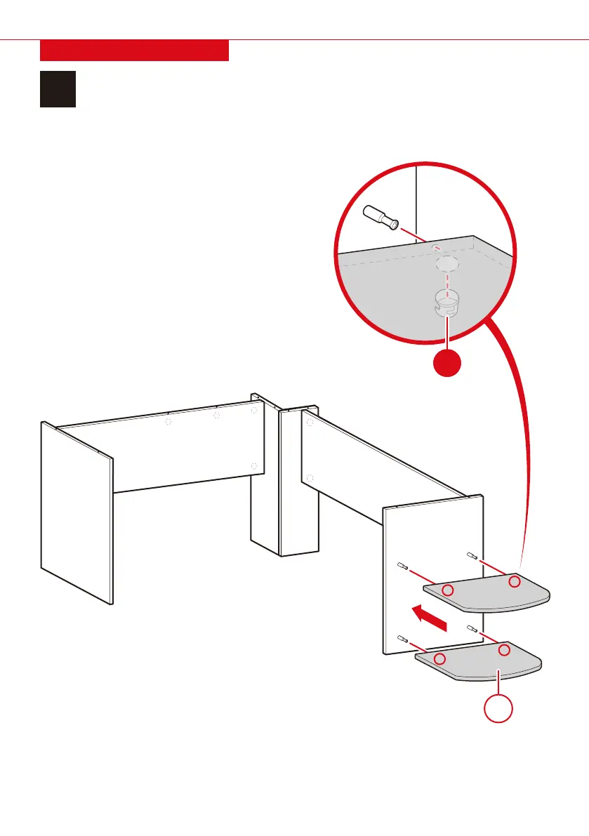 Insert four part D cam locks into the shelves, and attach the shelves by locking the cam locks.