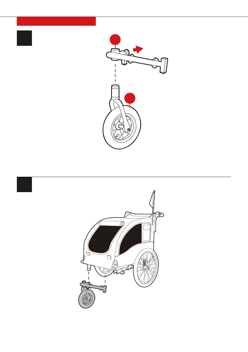 Loosen the two back knobs on the part E fork, slide the fork/wheel onto the front of the trailer, and then