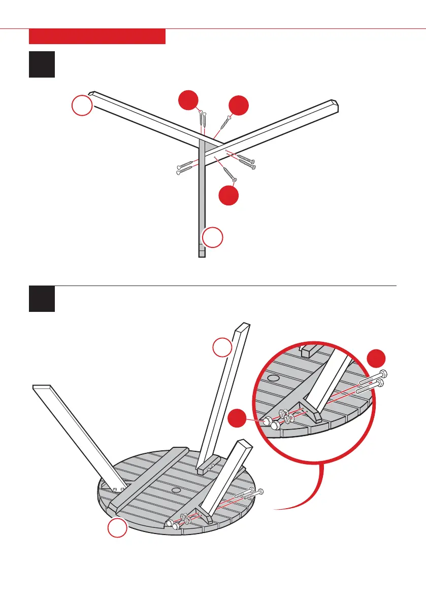 Attach three part D legs to the part A tabletop with six part 2 bolt sets. Place six part 7 end