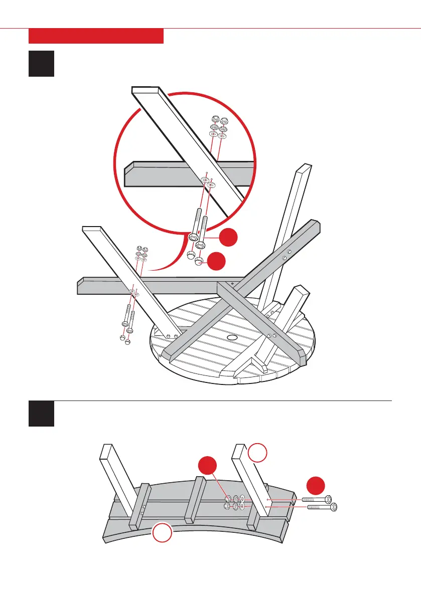 Attach two part F bench legs to a part B bench with four part 2 bolt sets. Place four part 7 end