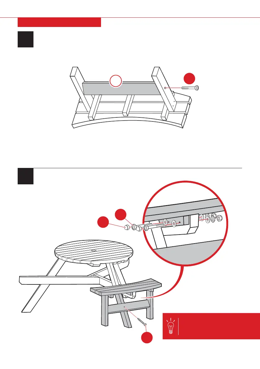 Attach the bench to the table with two part 1 bolt sets. Place four part 6 end caps on the