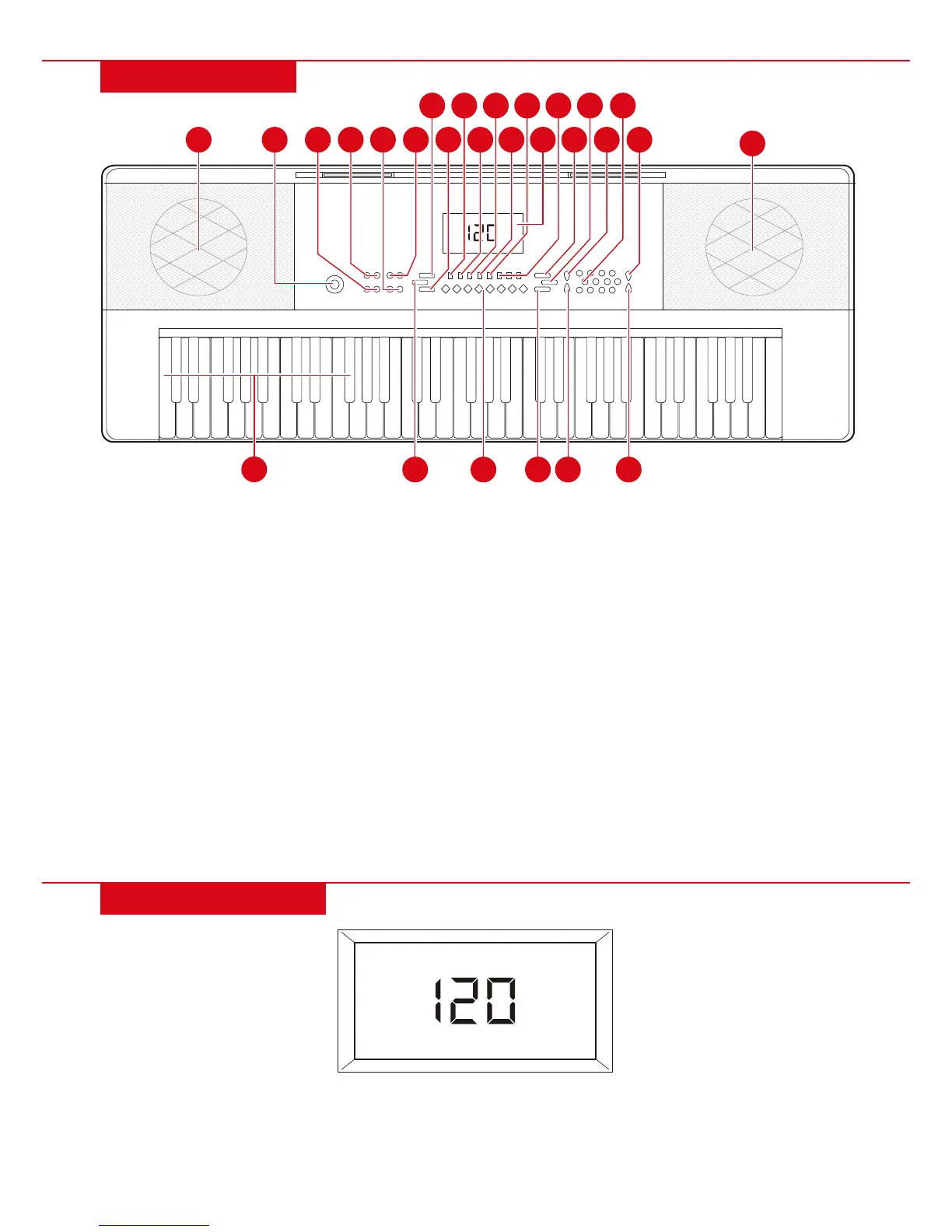 NOTE: When turned on, keyboard will default to 000 timbre and 000 rhythm with 120