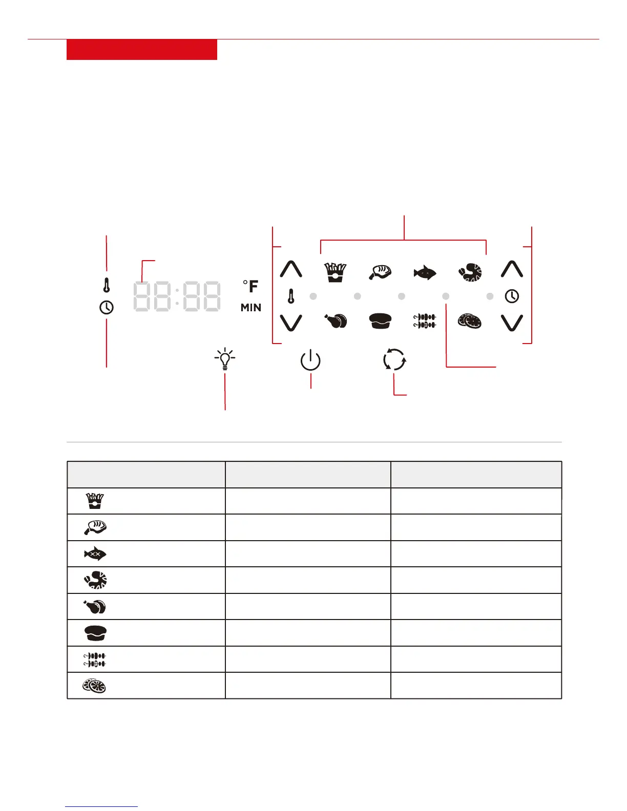 • ROTATION: Toggle rotating function on/o. Requires rotating basket or rotisserie shaft