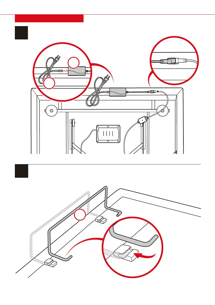 Insert the part B power cord into the part C power supply, then join the power supply to the