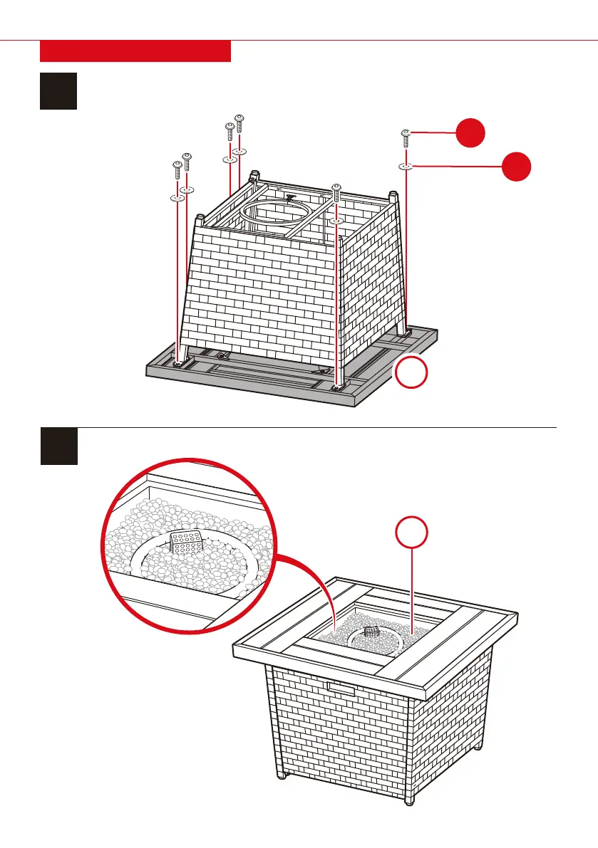 Carefully flip the table base over and attach it to the part B tabletop with six part 2 screws and