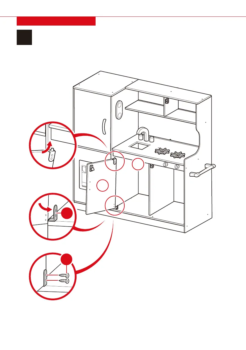 Insert the hinge peg on the part 16 sink cupboard door into the opening on the part 9 counter panel.