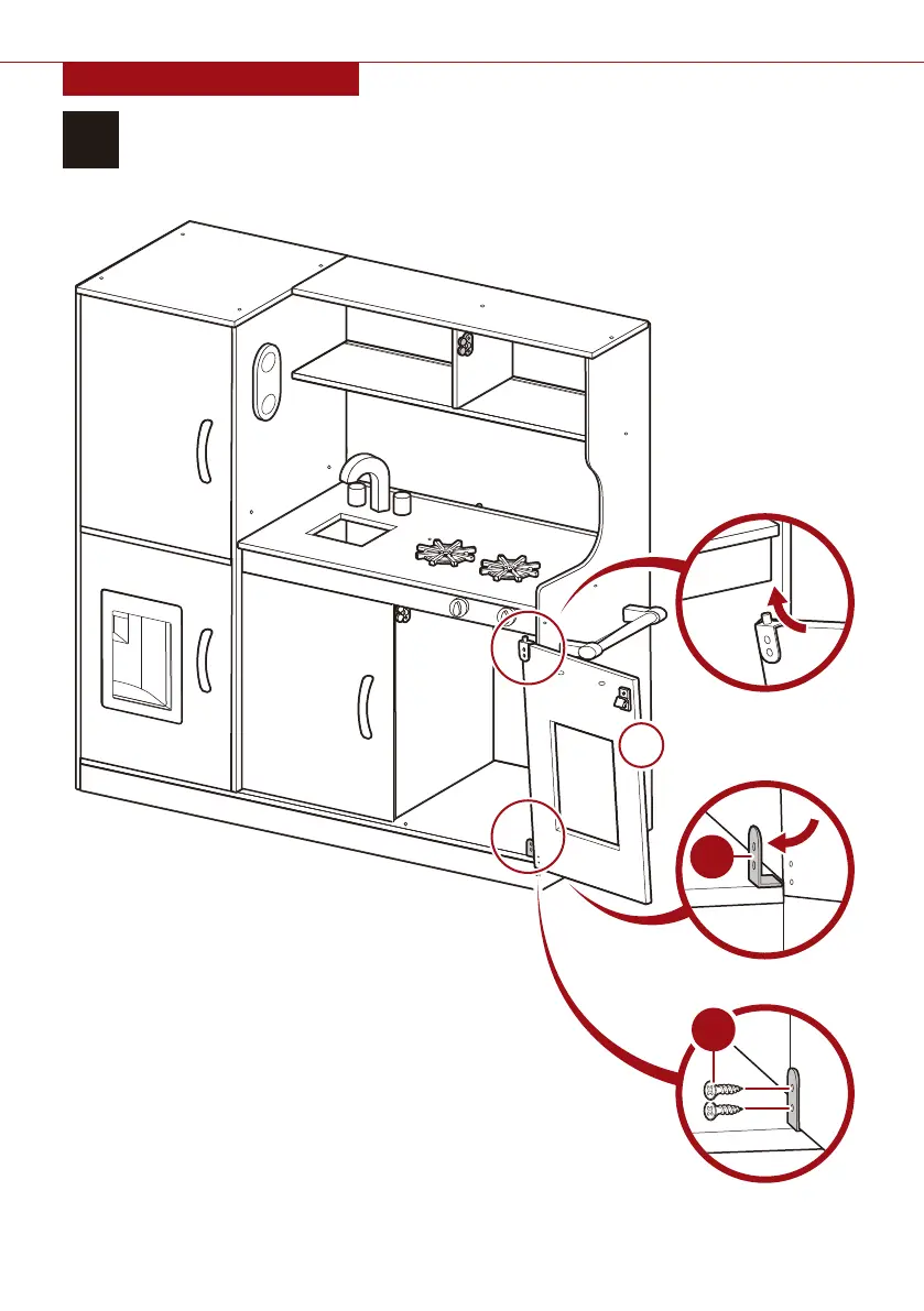 Insert the hinge peg on the part 17 oven door into the opening on the part 9 counter panel.