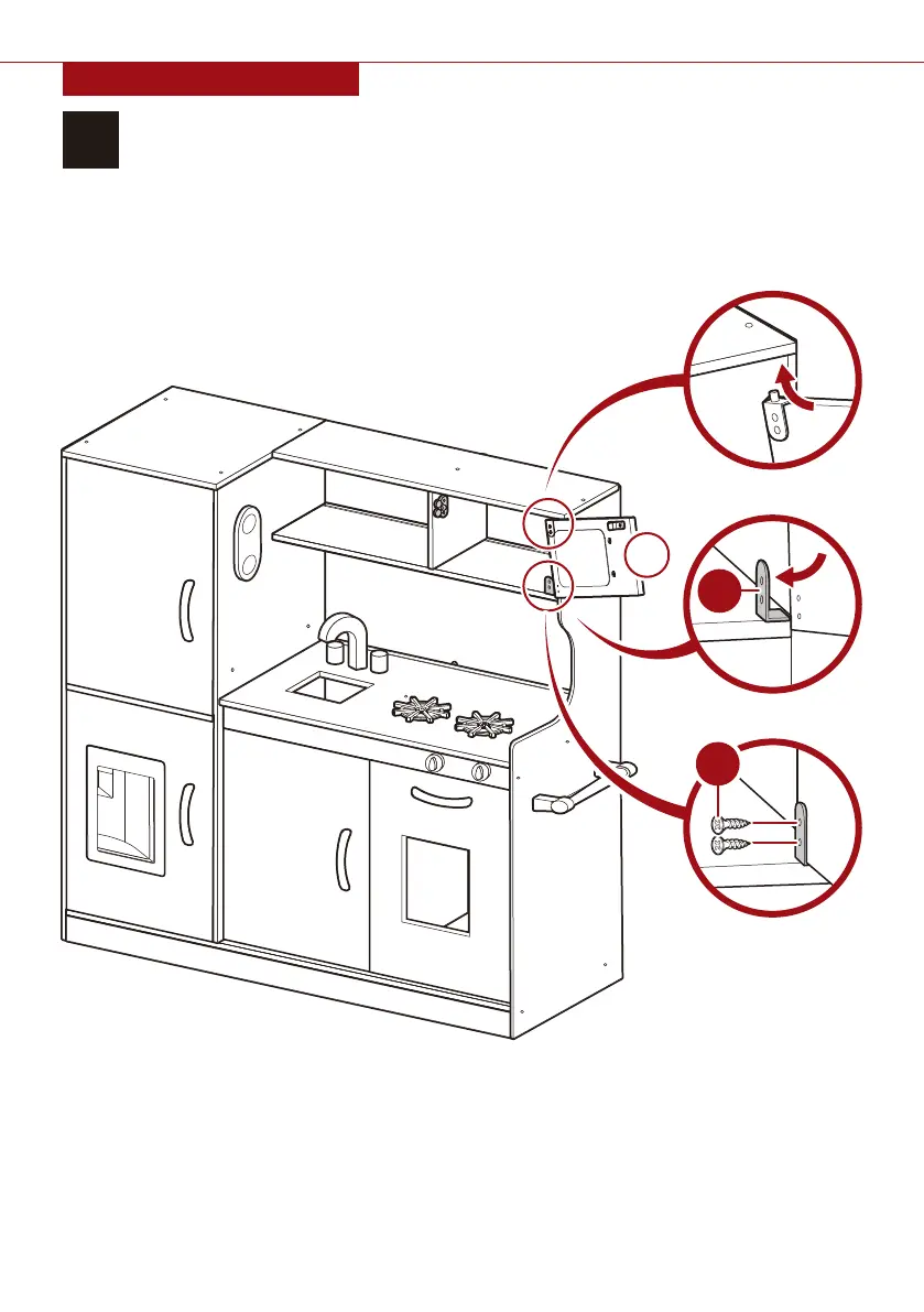 Insert one part H hinge peg into the opening on the part 7 lower shelf, and secure to the part 14