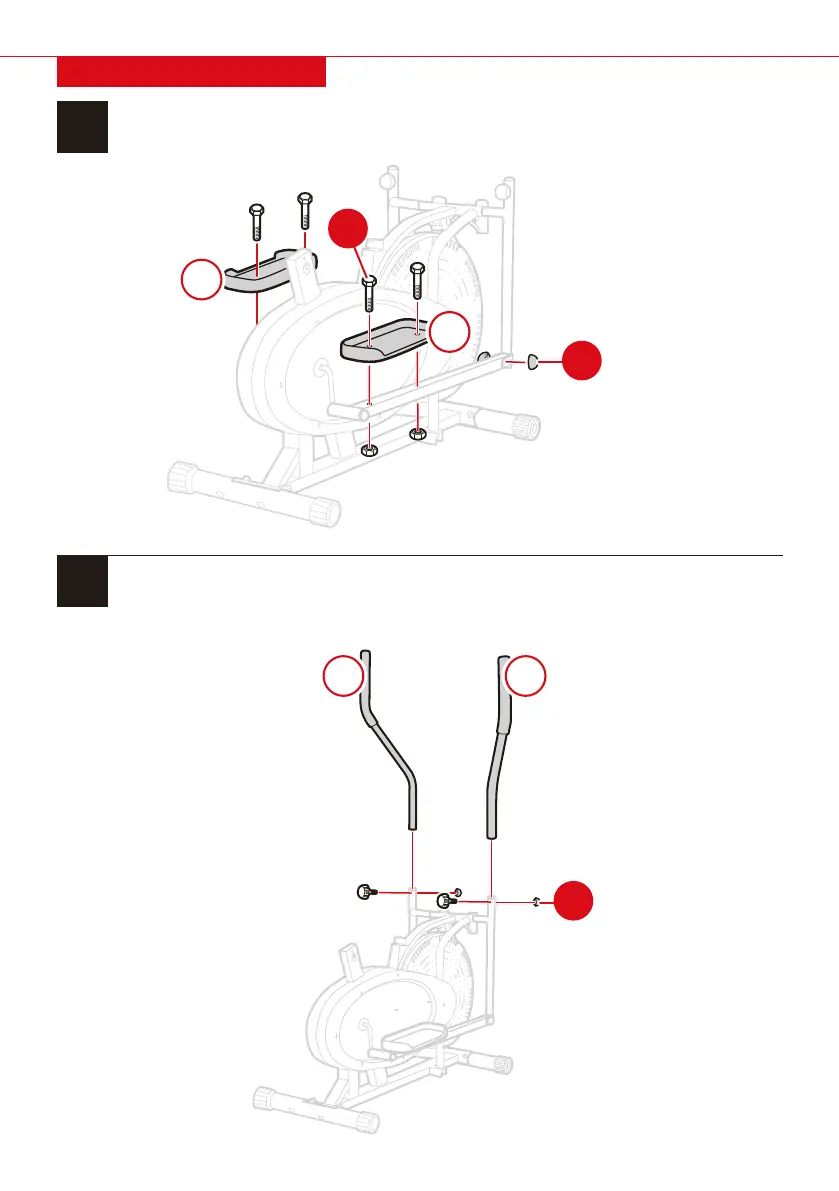 Attach the part F and G pedals with four part 8 bolts and nut sets.