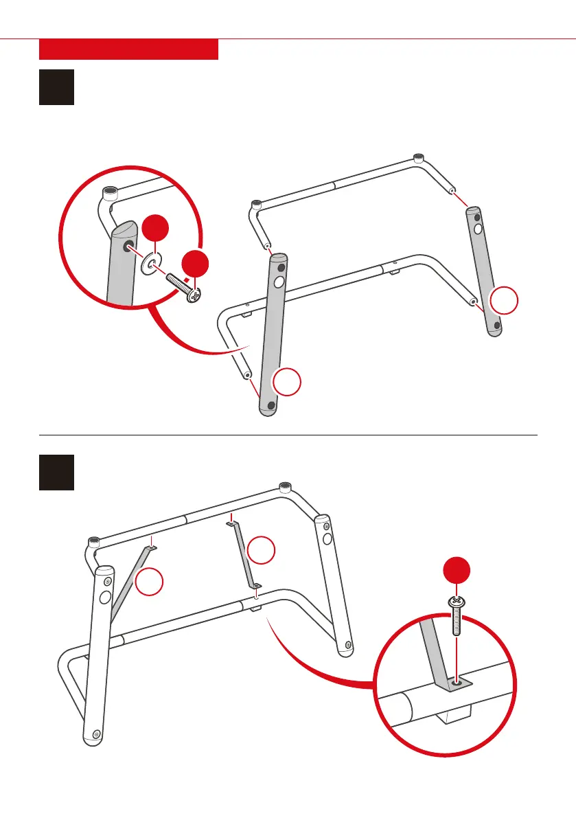 Attach two part A upper frame bars to the part E legs with two part 2 plastic washers and two