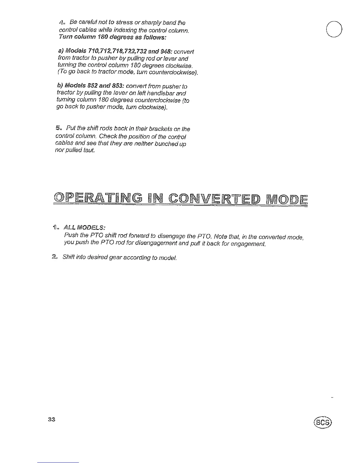 BCS 722 Harvester - OPERATING IN CONVERTED MODE; OPERATING THE UNIT IN CONVERTED MODE