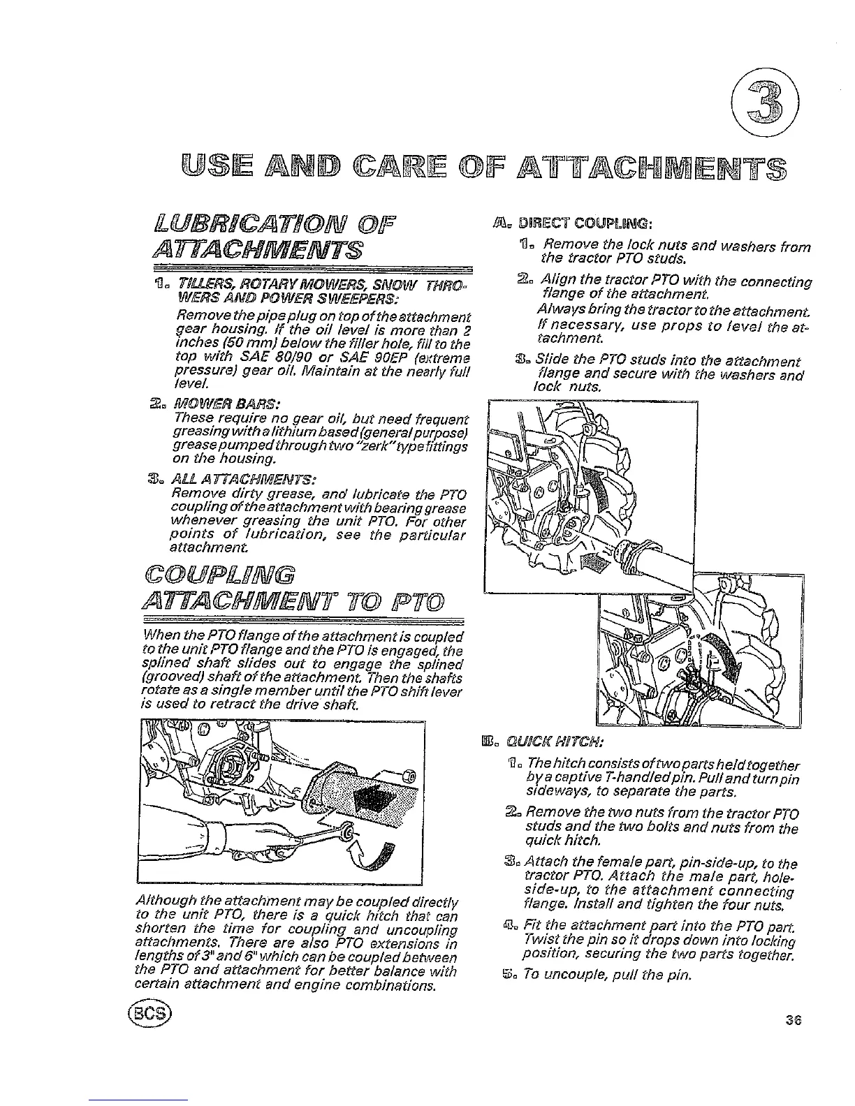 BCS 722 Harvester - USE AND CARE OF ATTACHMENTS; ATTACHMENT LUBRICATION REQUIREMENTS; COUPLING ATTACHMENTS TO PTO