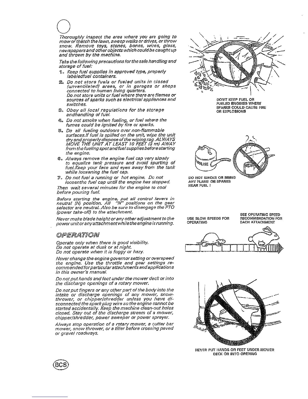 BCS 722 Harvester - OPERATION GUIDELINES; SAFE FUEL HANDLING AND STORAGE; GENERAL OPERATION RULES