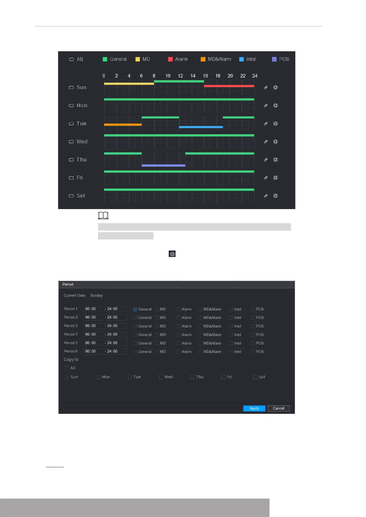 For example, the alarm snapshot period is from 6:00–18:00 Monday, device can snapshot