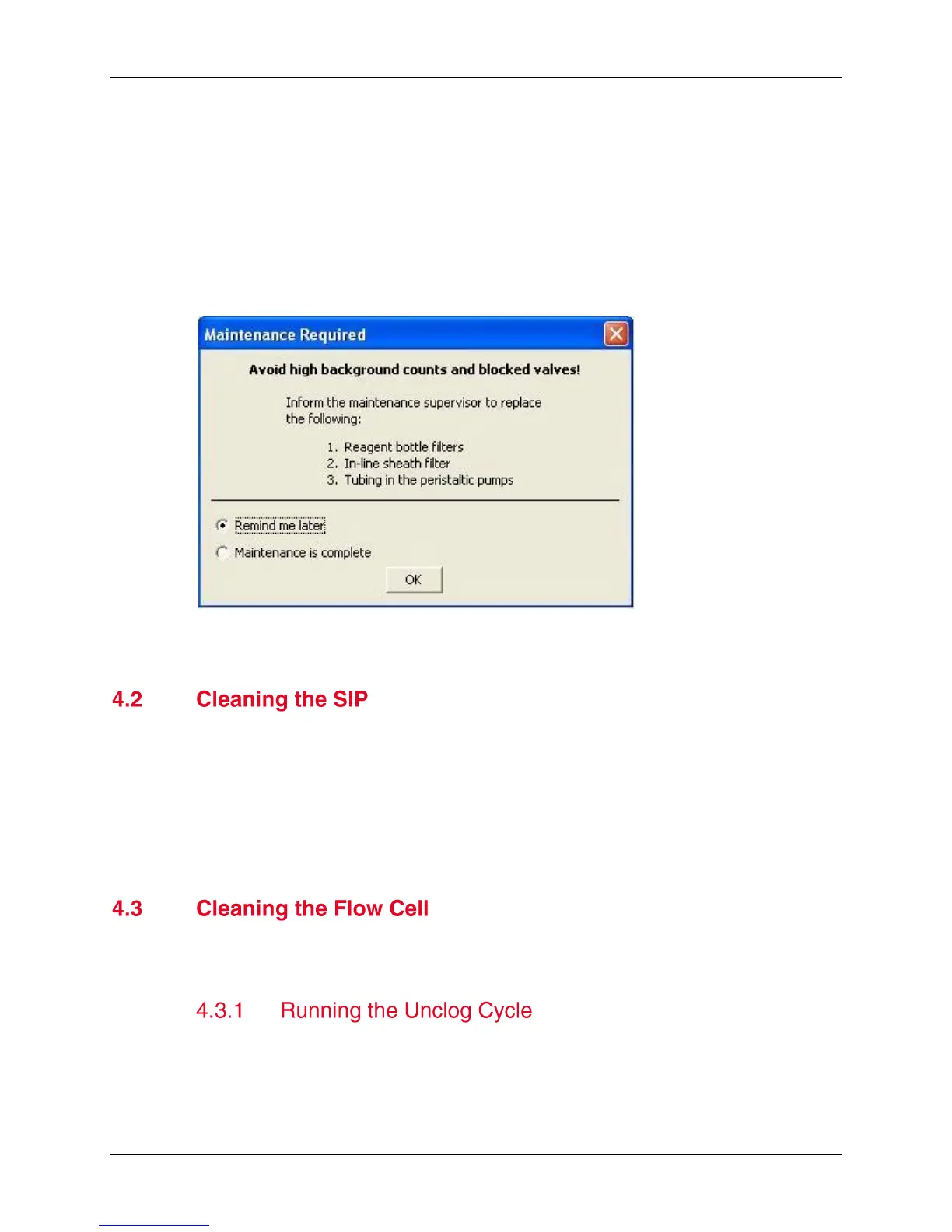The unclog cycle purges the flow cell of debris.