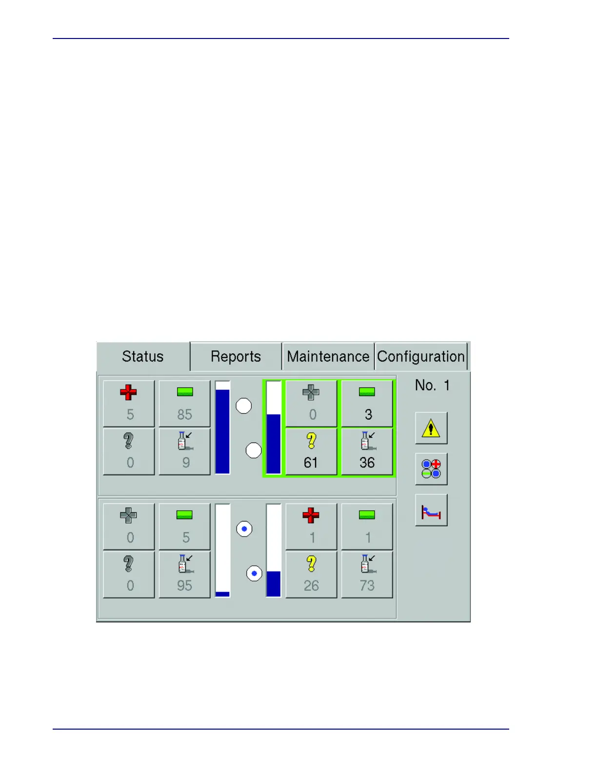 The Status display is shown in Figure 4-1. It provides a quick overview of testing status, station