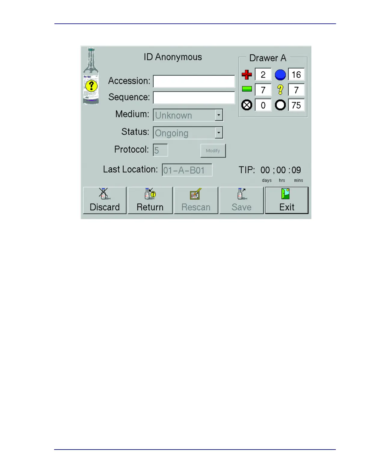 Counters for positive vials (+), negative vials (–), blocked/unusable stations (), ongoing vials