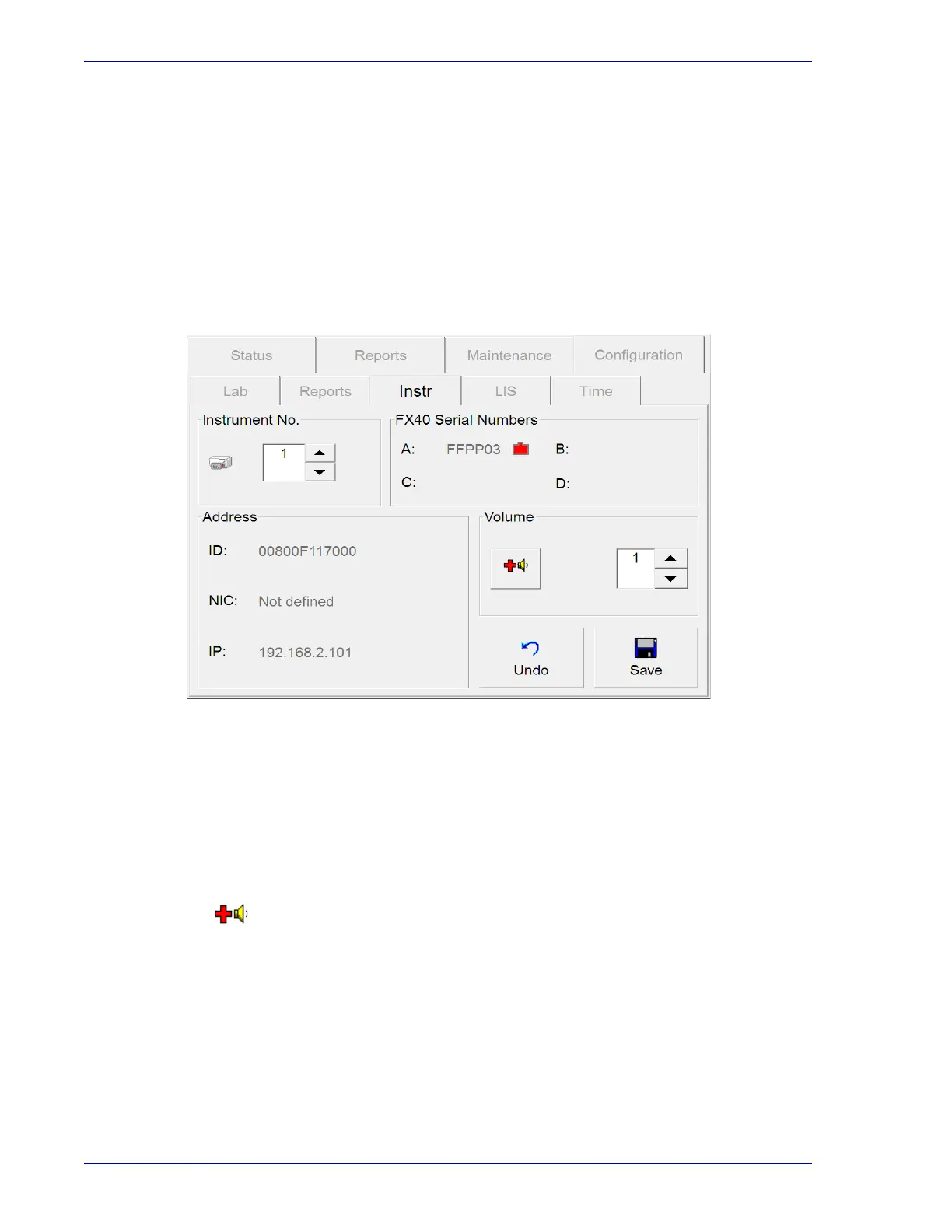 Figure 2-6 – Instrument Configuration Display (BD BACTEC™ FX40 Serial Number icon red)