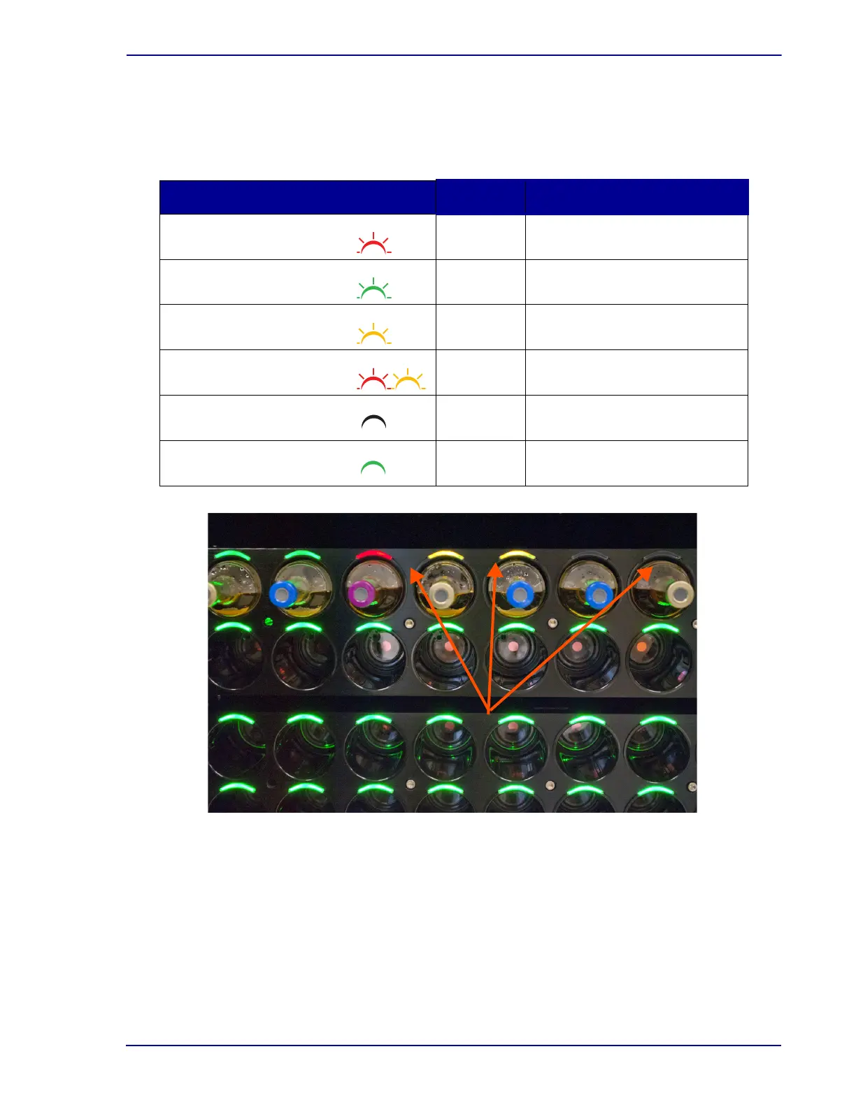 The color (red, green, or yellow) and state (on, flashing, or off) indicate the conditions shown in the