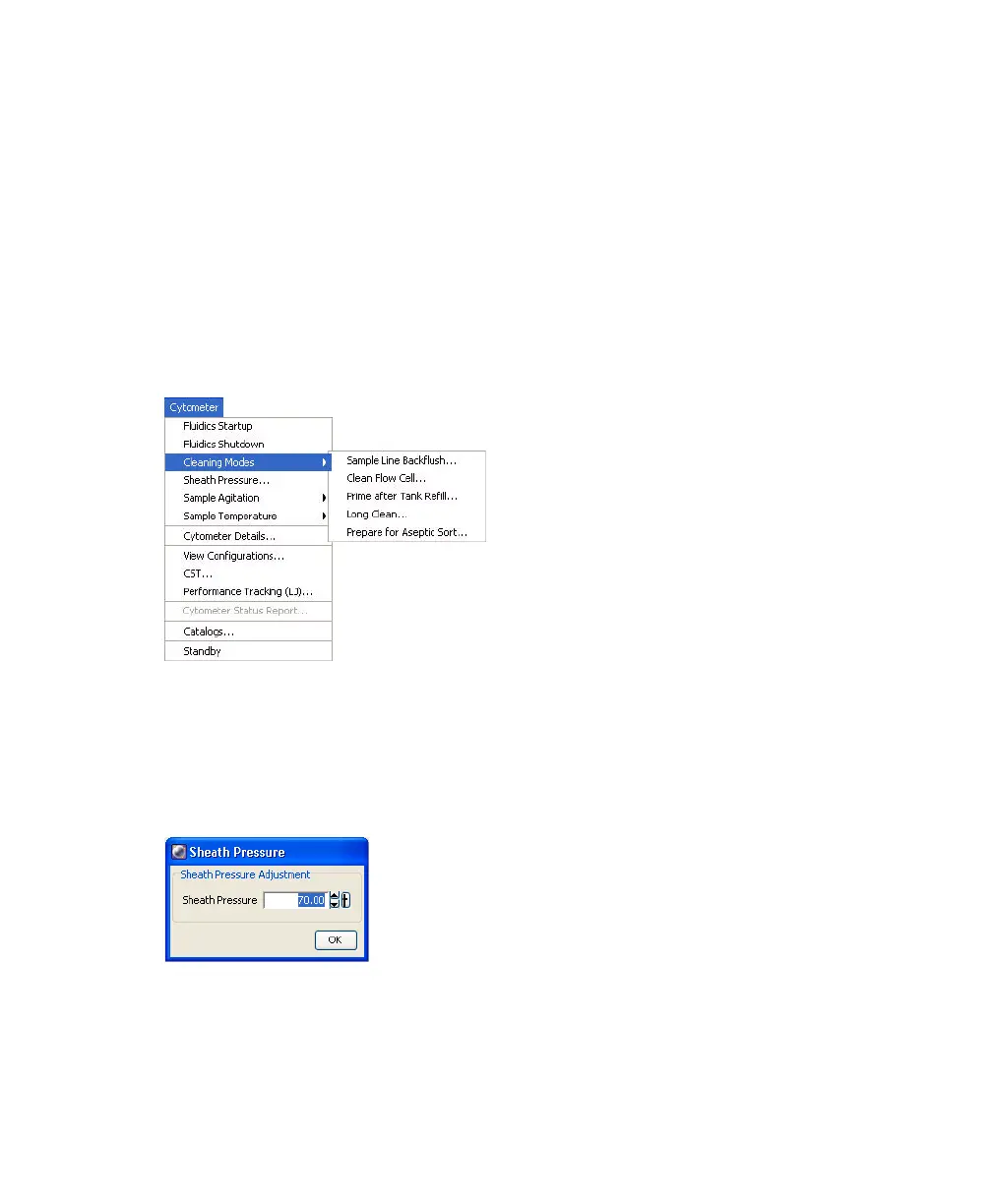 beam. Select Cytometer > Sheath Pressure to access a dialog box where you can