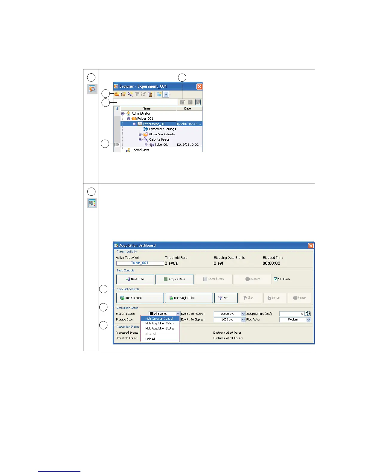 shown. Carousel Controls (e), Acquisition Setup (f), and Acquisition Status (g) can