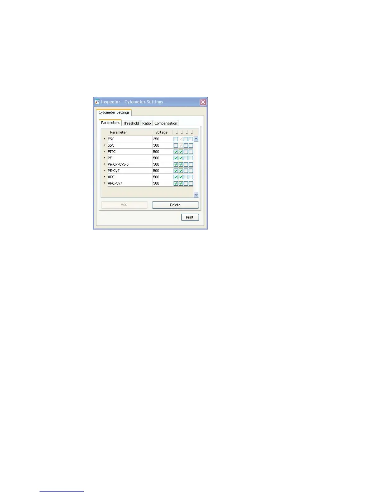 5 Select the experiment-level cytometer settings, and click the Parameters tab
