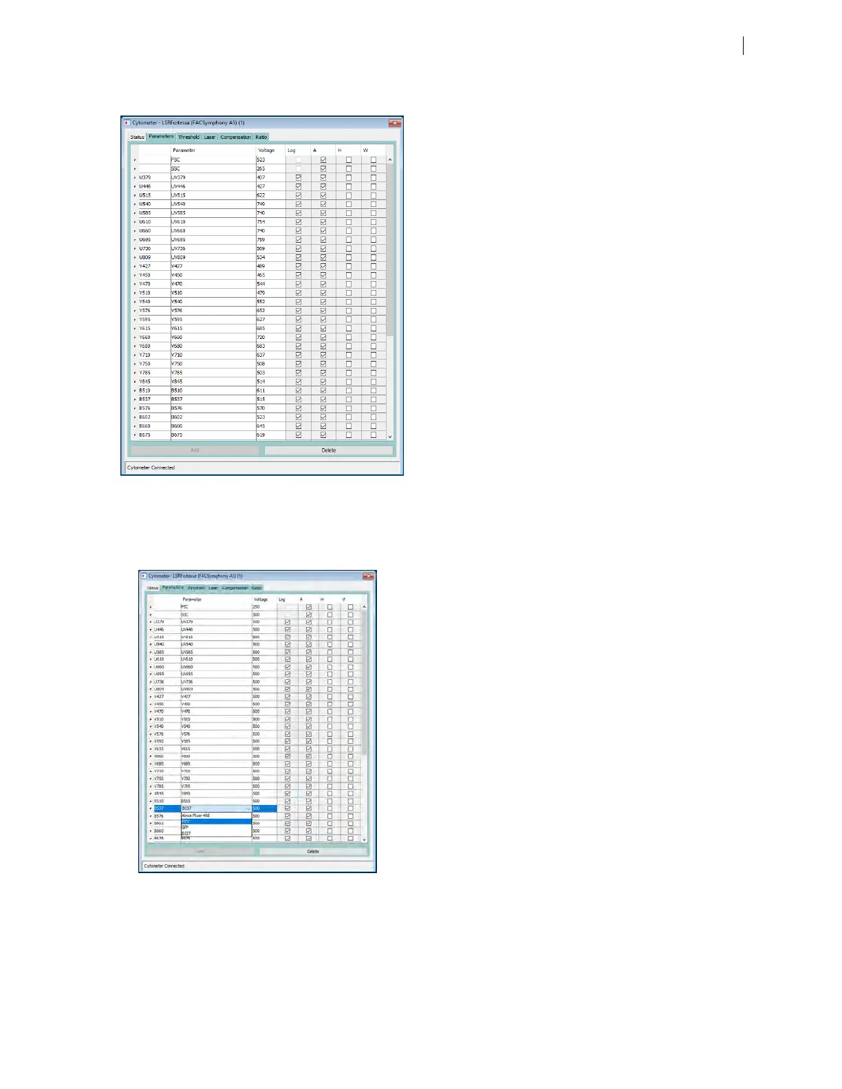 a. Click a Parameter name to display the available fluorochromes in the Parameters list.