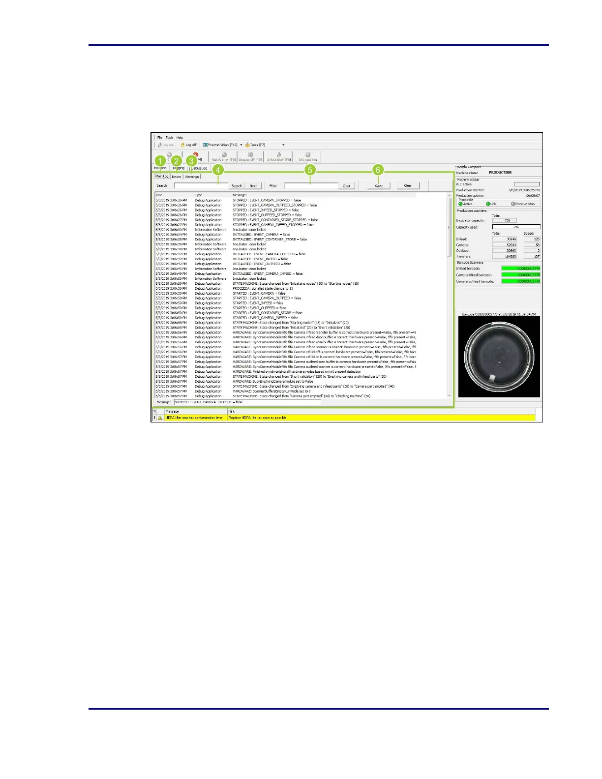 1. The Debug Log is defaulted to the Main Log tab, which shows all log activities.