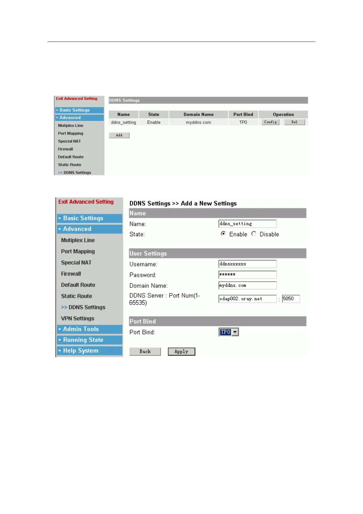 DDNS Server, Port Num: fill in the server and port that are provided by PeanutHull. The