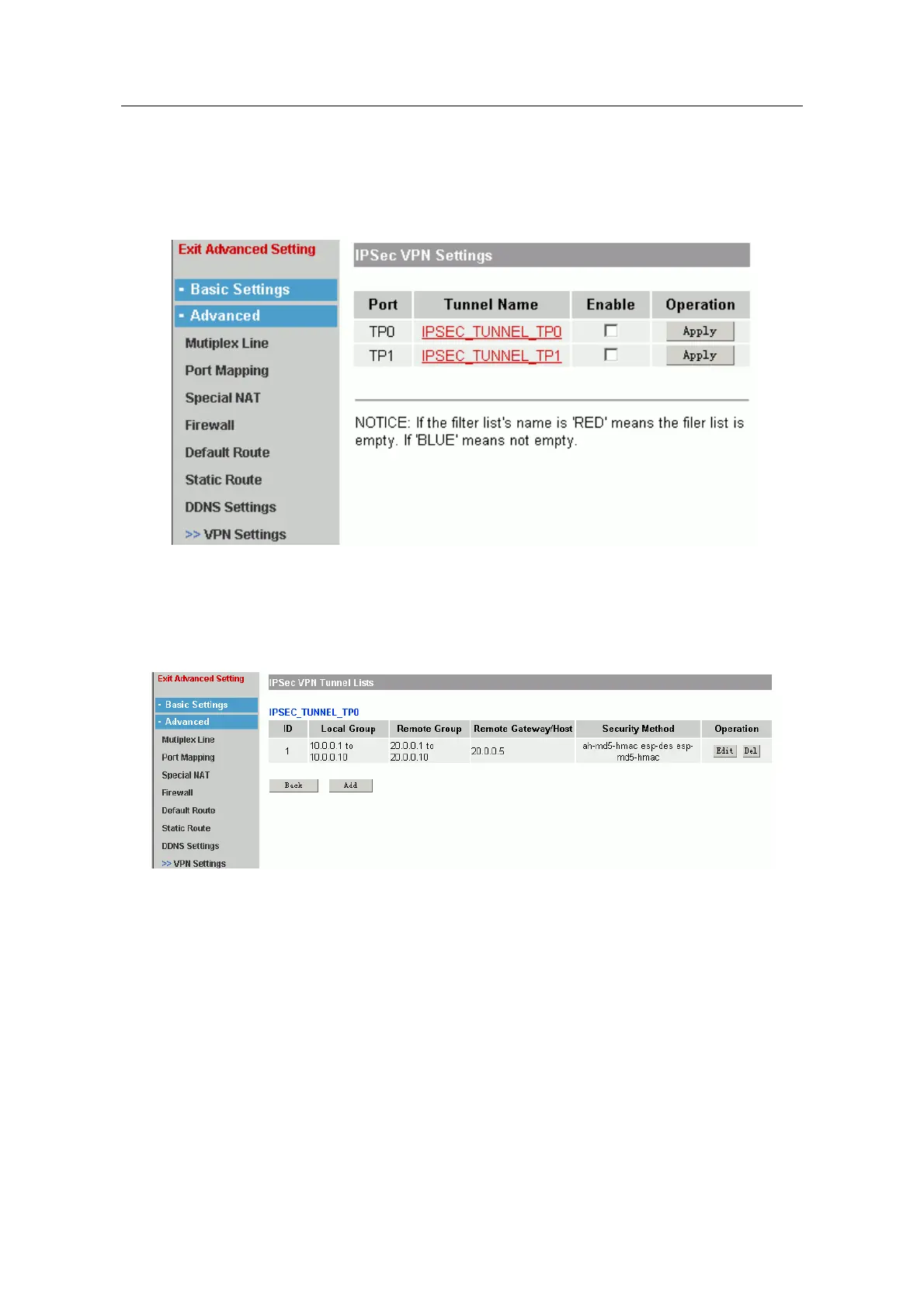The routers support VPN, and you can configure IPSec. It is used to establish a tunnel