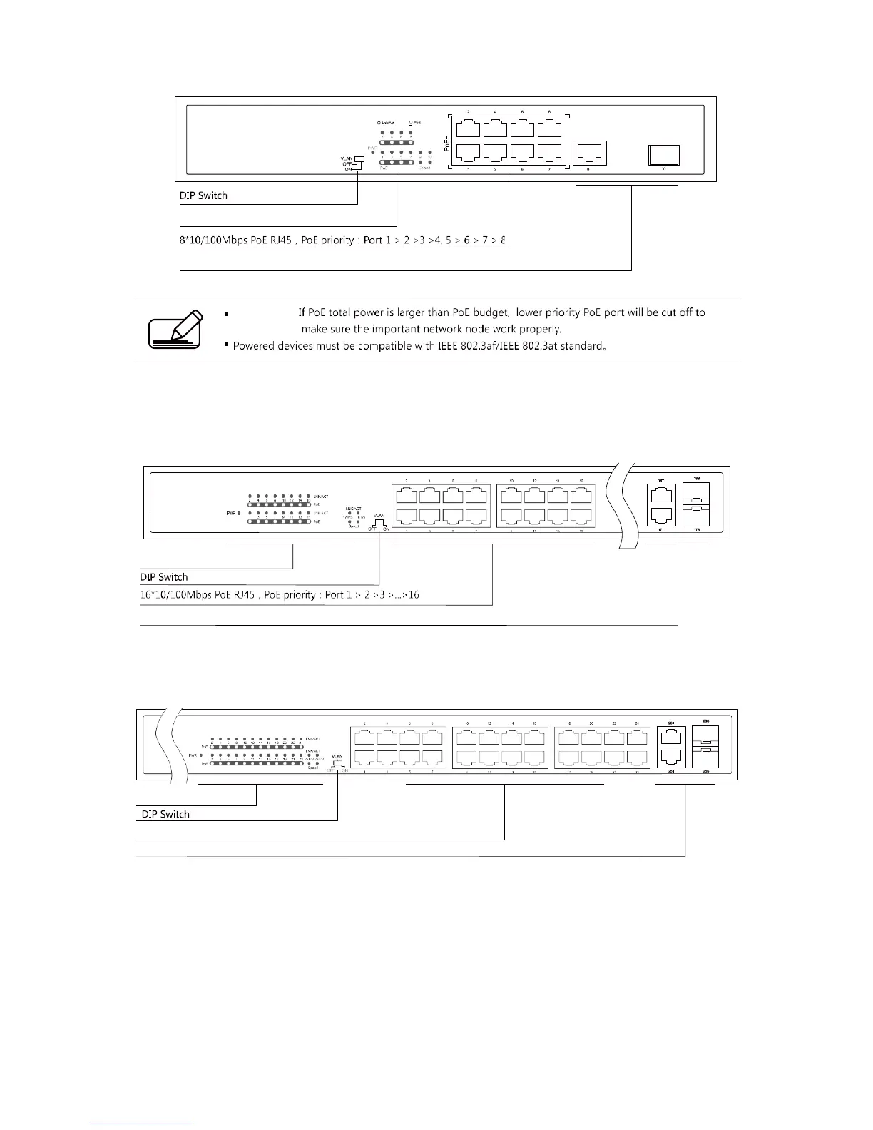 24*10/100Mbps PoE RJ45,PoE priority:Port 1 > 2 >3 >...>24