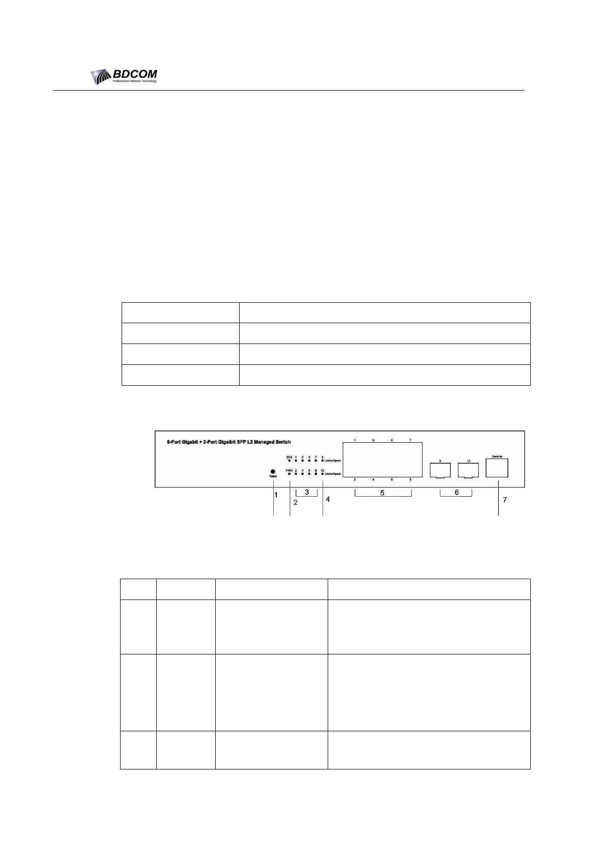 Table 1- 2 Parts at the front template of the BDCOM S2510-C switch