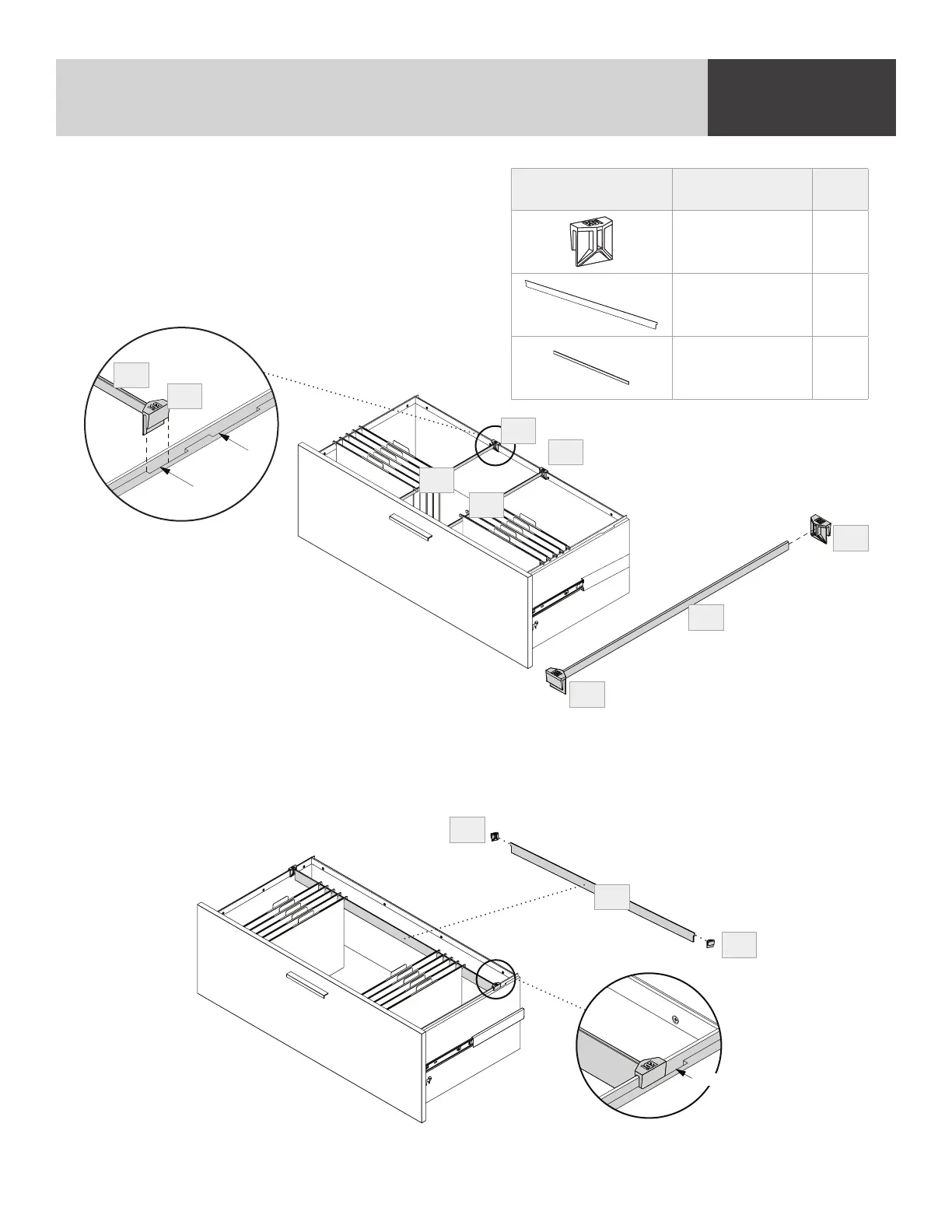 Place the file bar assembly in the notches located on the left and right drawer side panels. For side