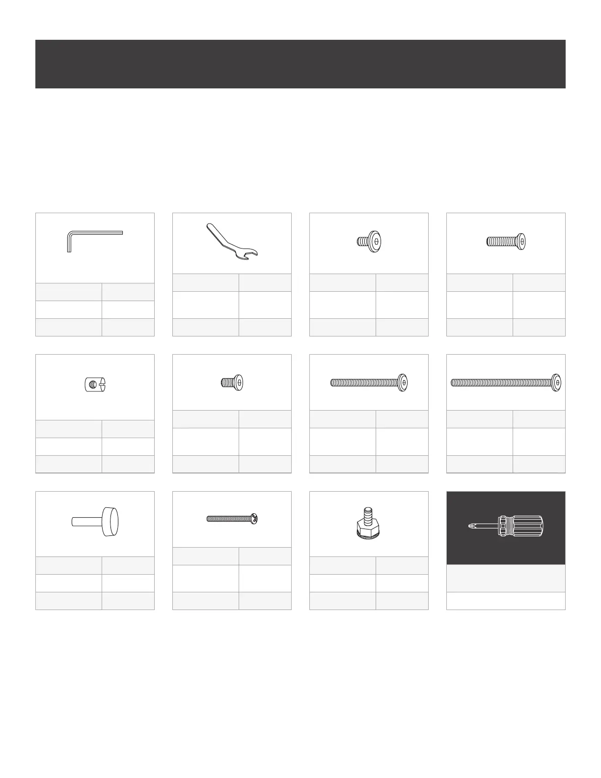 Unpack and identify the parts listed below. The assembly workspace should be a non-marring