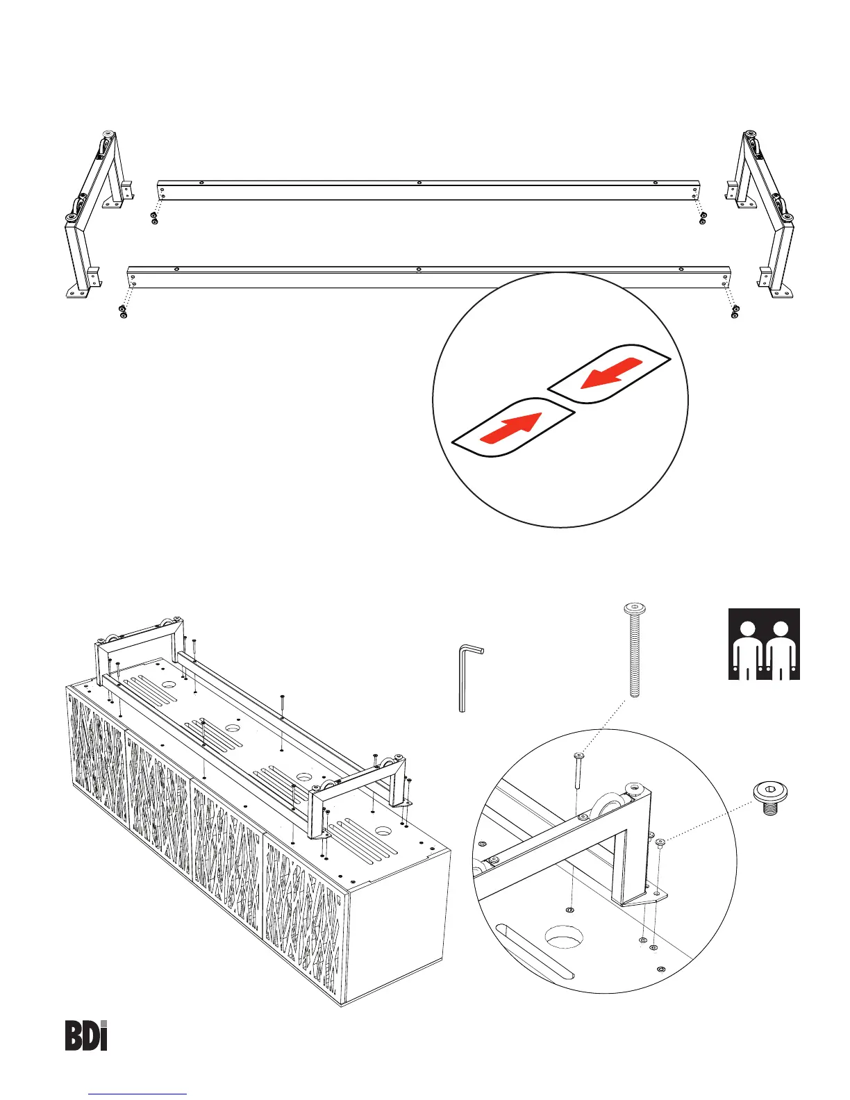 MUST align arrows on Base Rails A2 with arrows on Metal Legs E for proper orientation.