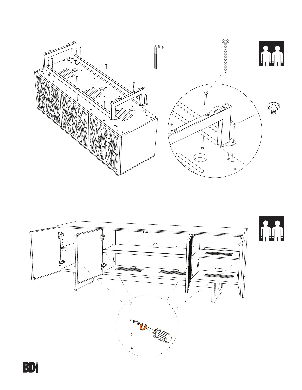 With help from another person, carefully rotate your Elements Media Cabinet onto its feet. The shelf pins located