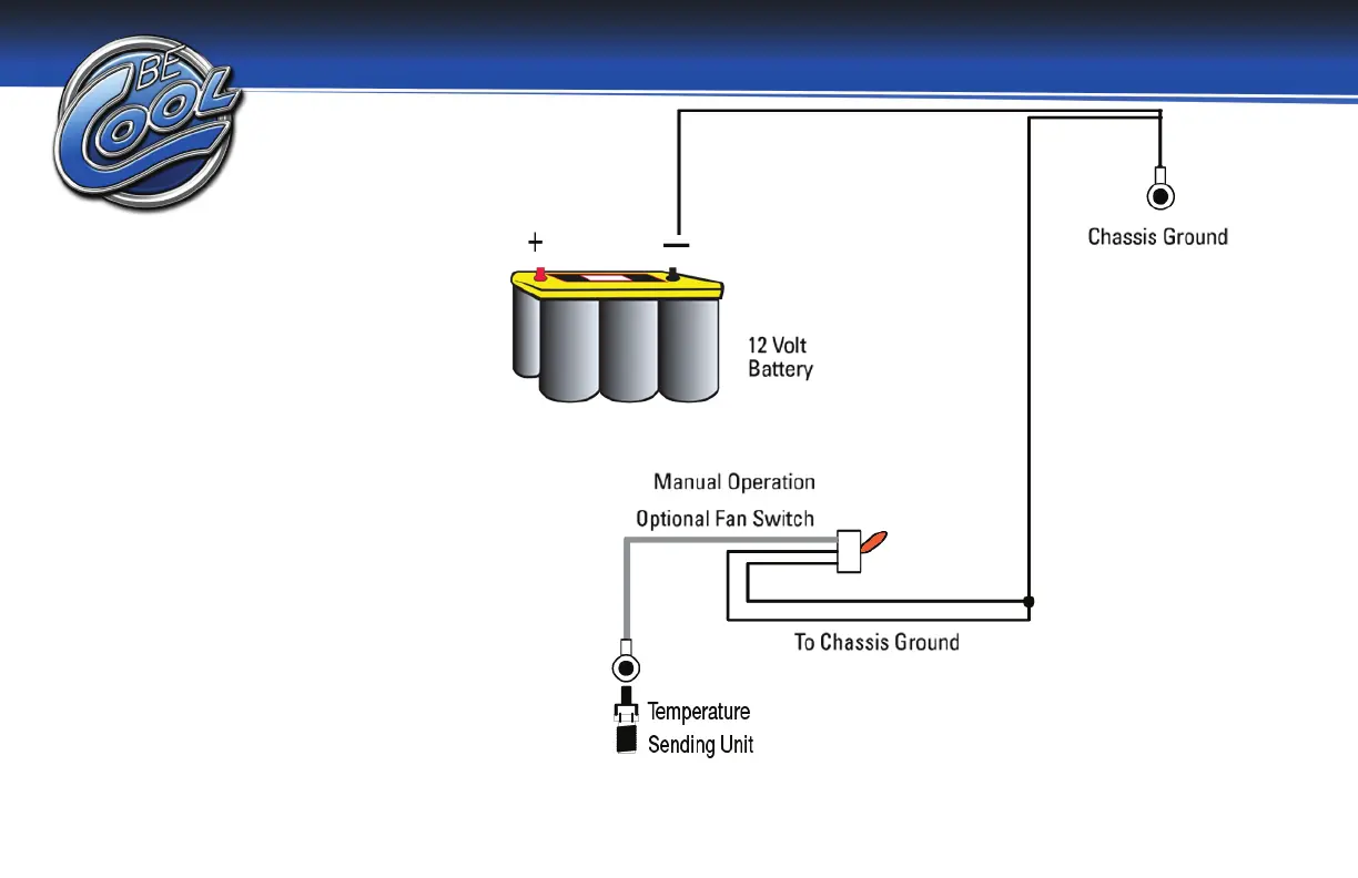 Connect a high amp toggle switch (Be Cool Kit #75096) to the temperature sending unit’s gray wire. This will