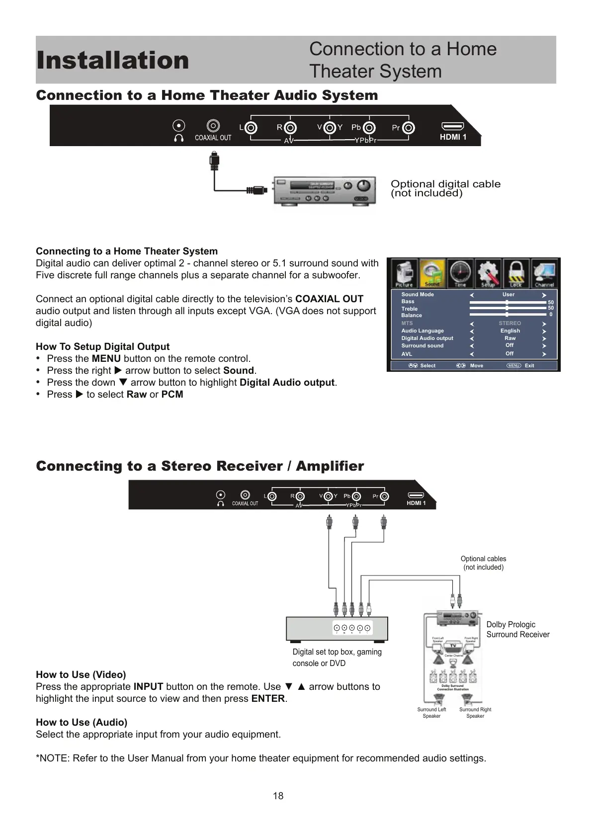 *NOTE: Refer to the User Manual from your home theater equipment for recommended audio settings.