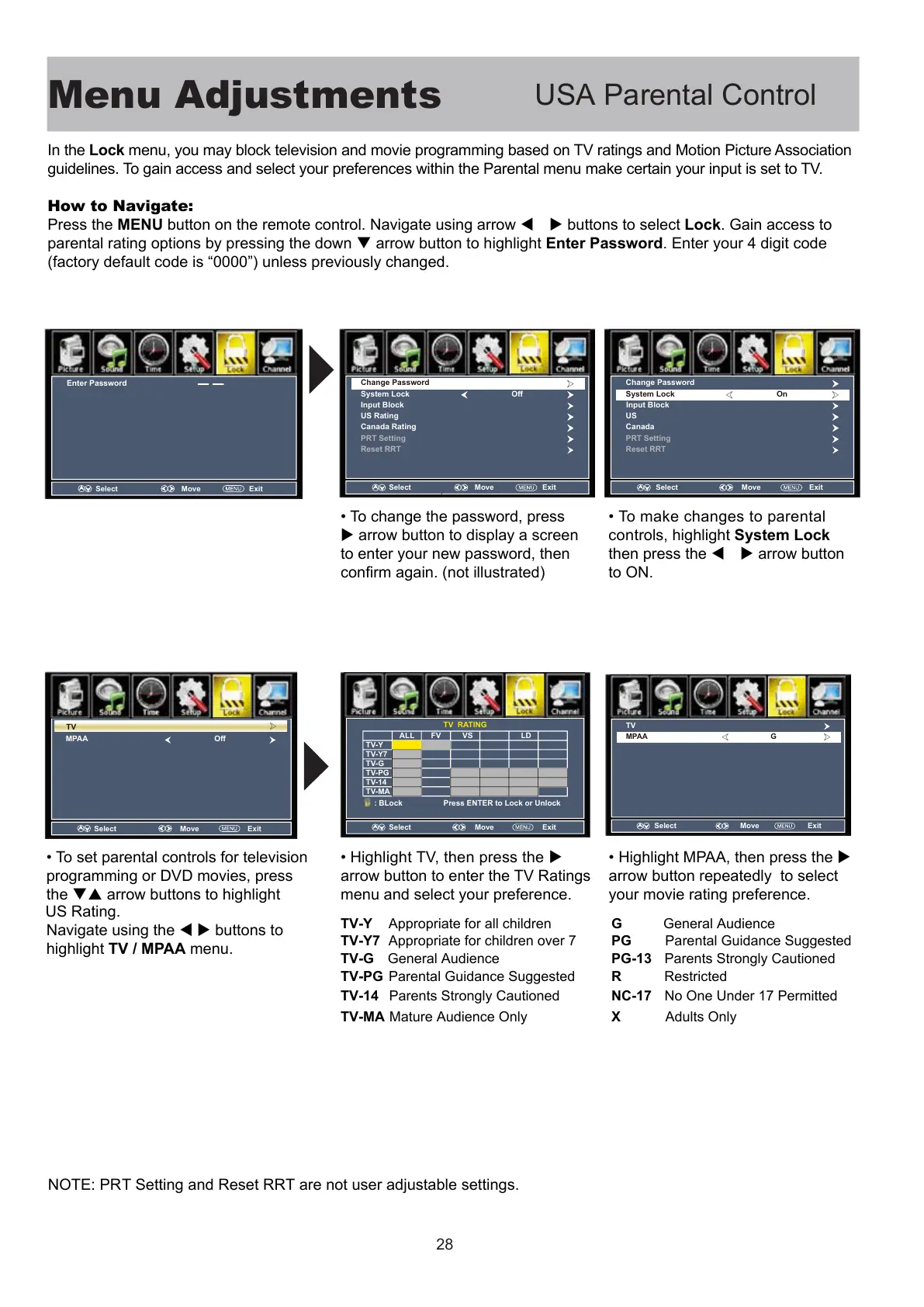 In the Lock menu, you may block television and movie programming based on TV ratings and Motion Picture Association