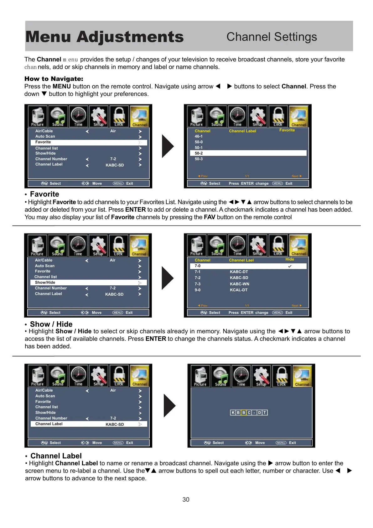 The Channel m enu provides the setup / changes of your television to receive broadcast channels, store your favorite
