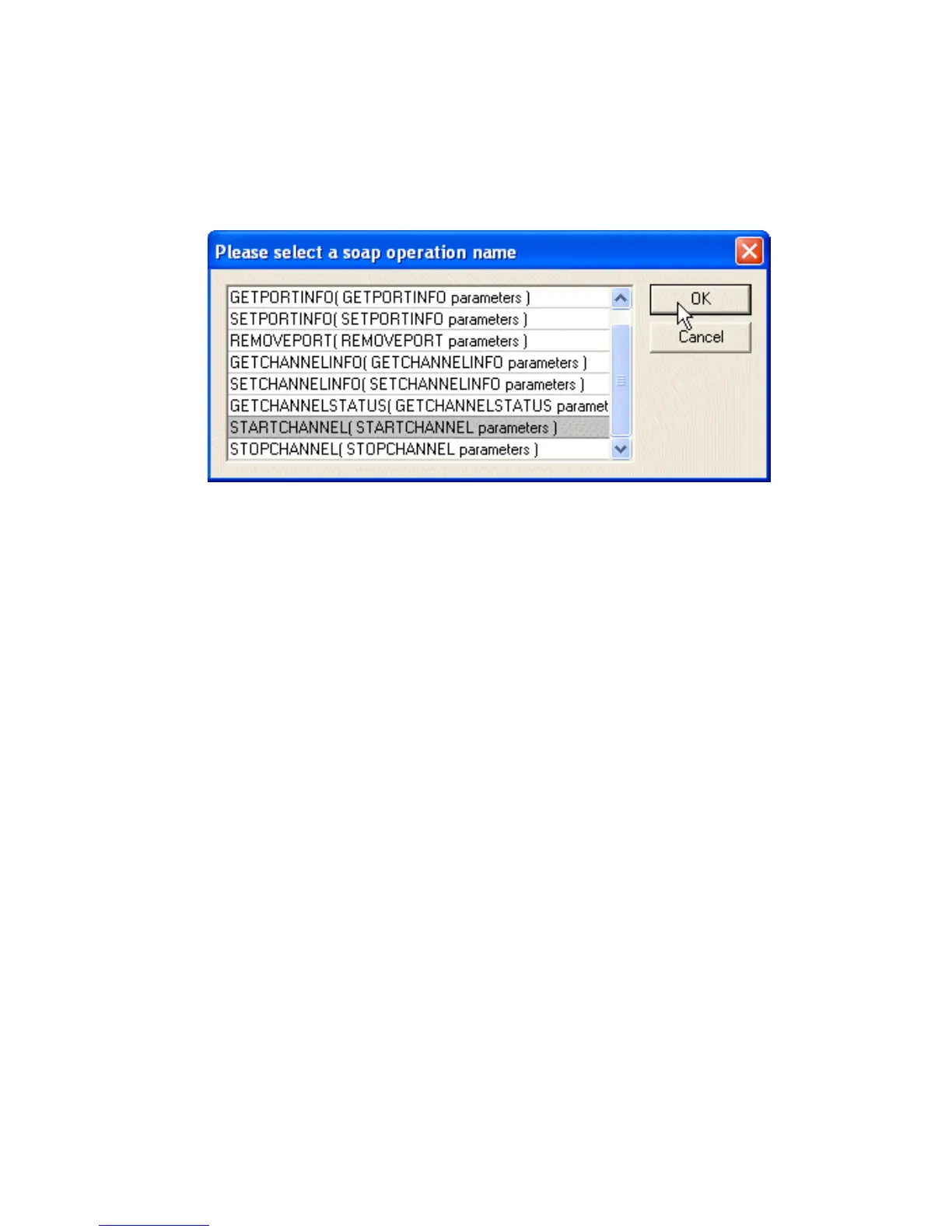 The following image shows the soap operation name dialog box that opens with a list