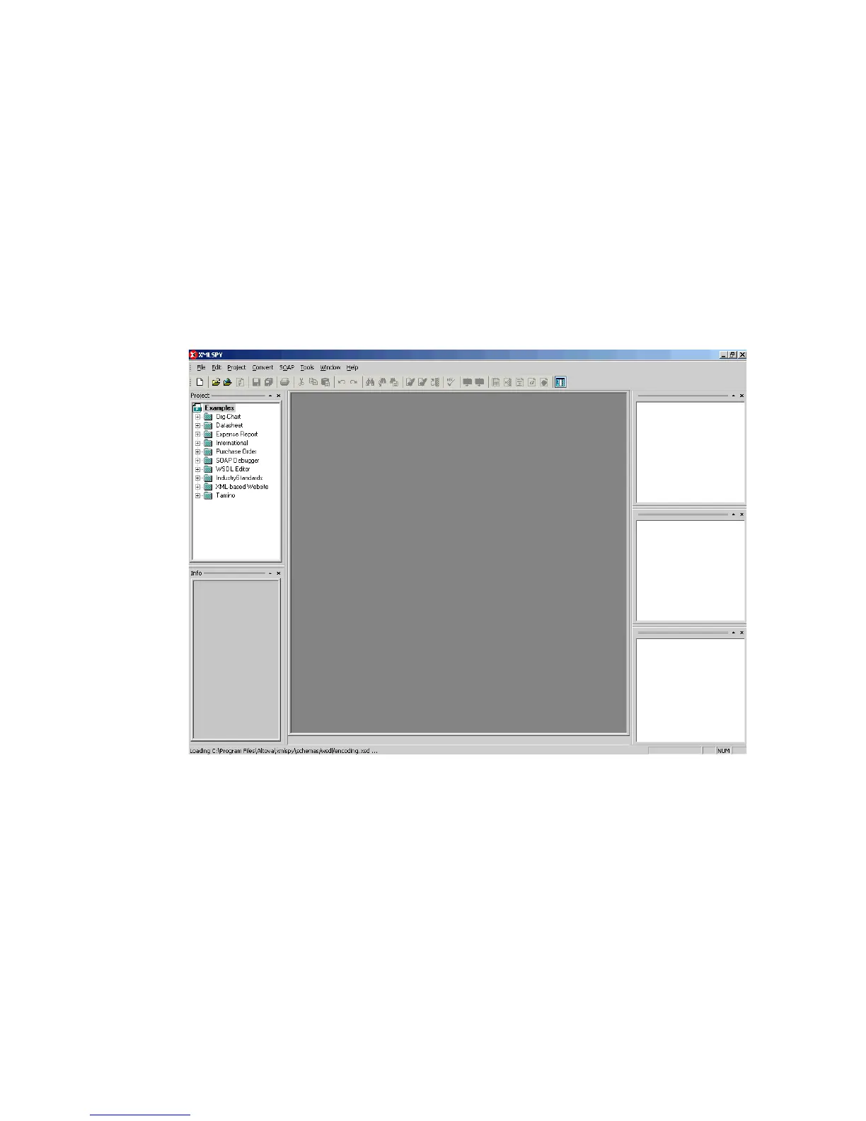 The following image shows the XMLSPY window. The upper left has a Project pane that