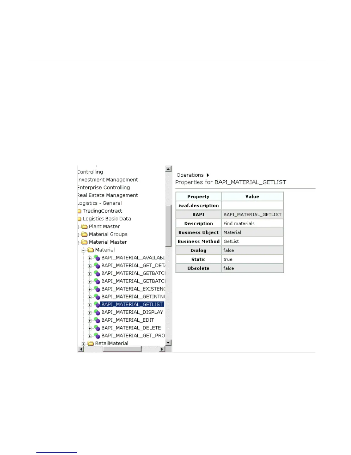 values for the BAPI method named BAPI_MATERIAL_GETLIST appears as shown in the