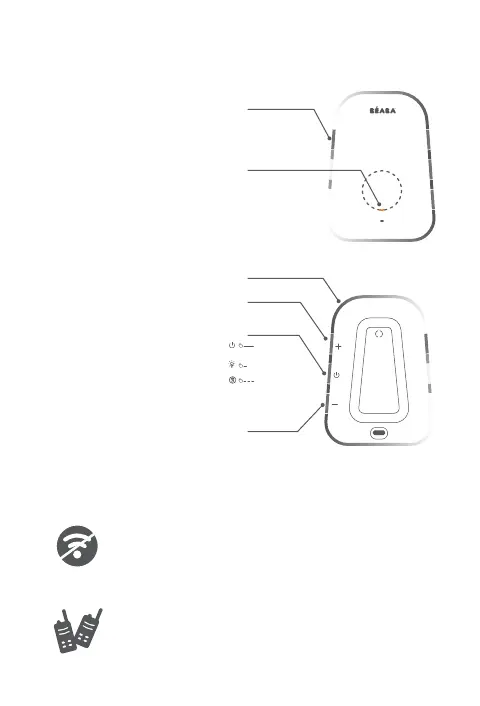 無線對講功能: 長按此按鍵以便與嬰兒端通訊。可