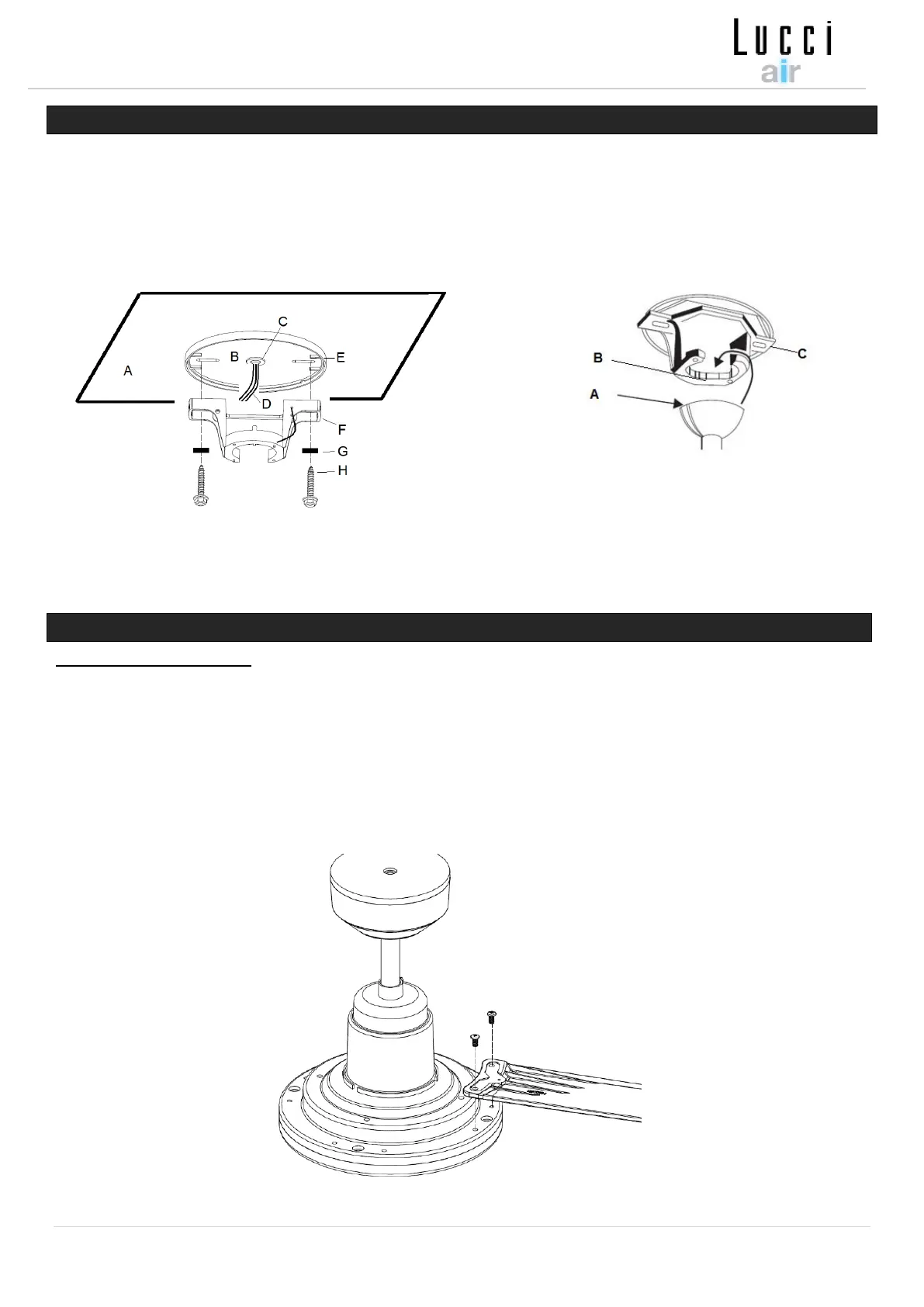 • Install the ceiling mounting bracket (F) and the canopy cover (E) on the outlet box (B) with the mounting