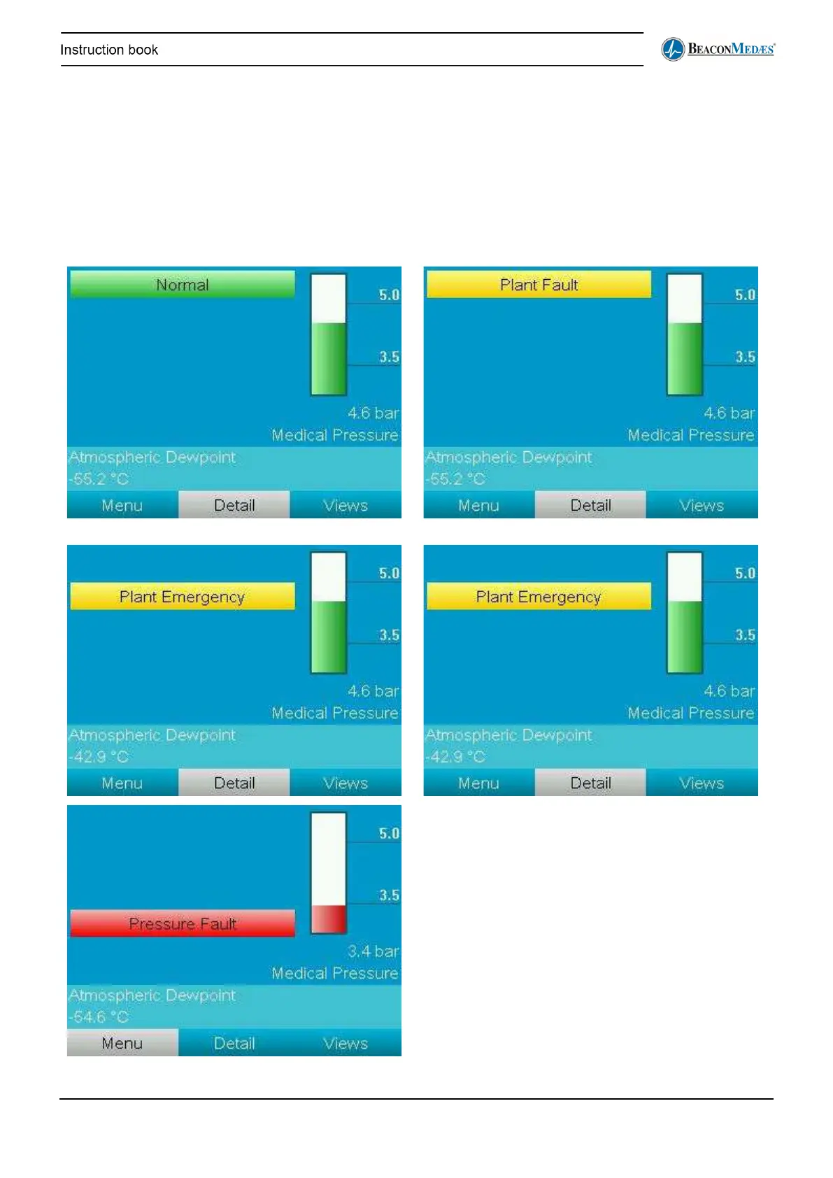 On the figure below the different statuses/alarms can be seen from left to right: normal operation,